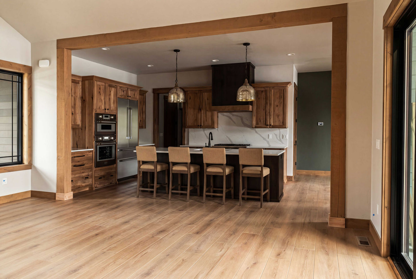 The quality of Safehaven Homes stands out: 10 foot ceilings throughout with 9 foot solid Alder doors and cabinetry, high vaults, beautiful timbers and cedar soffit, luxury flooring installed perfectly, high-end windows, very high-end appliances, precise trim work, quartz countertops throughout, a full blacktop driveway, and thoughtful details like upgraded insulation and extra-firm floor joists as we requested.